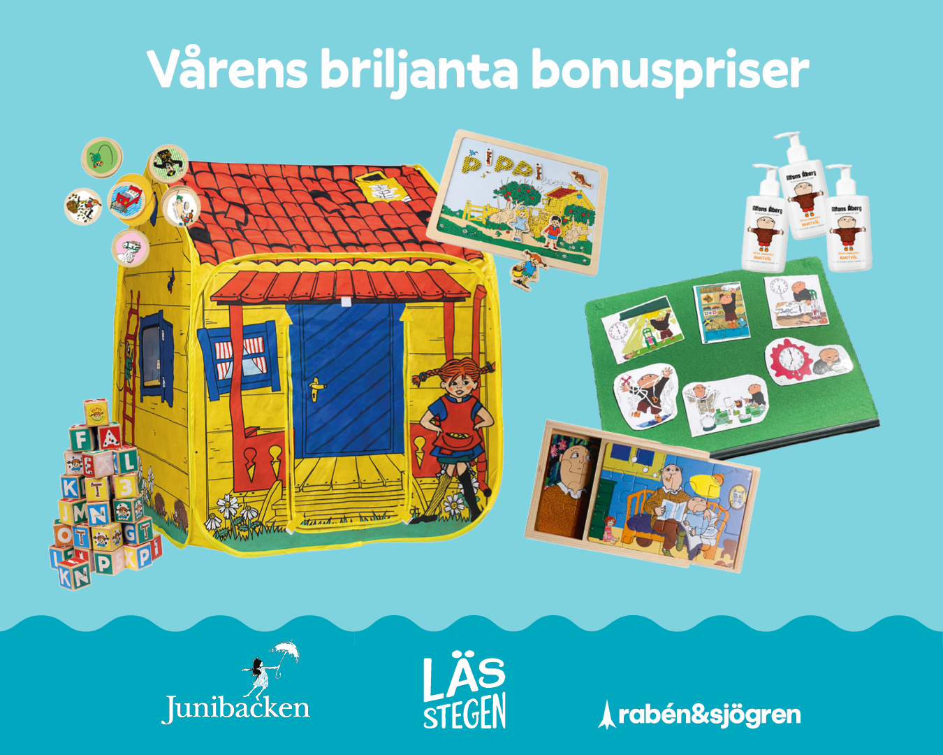 Utöver vinsten av en heldag tillsammans på Junibacken och stort bokpaket från Rabén & Sjögren har vi i vår dessutom några finfina bonuspriser med barnens favoritkaraktärer!
